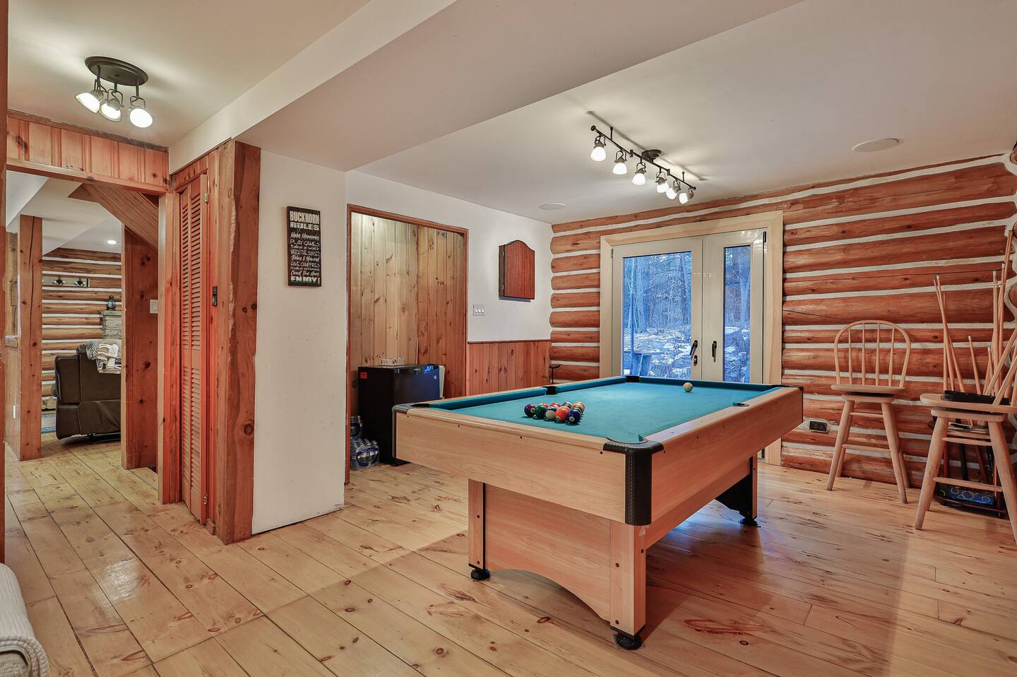 Games area with pool table and entrance to back deck patio.