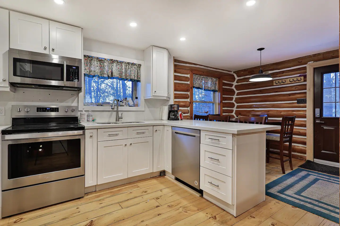 The Buckhorn Log Home is fully equipped with a propane BBQ, outdoor fire pit, indoor fireplace, newly renovated kitchen, and brand new appliances.