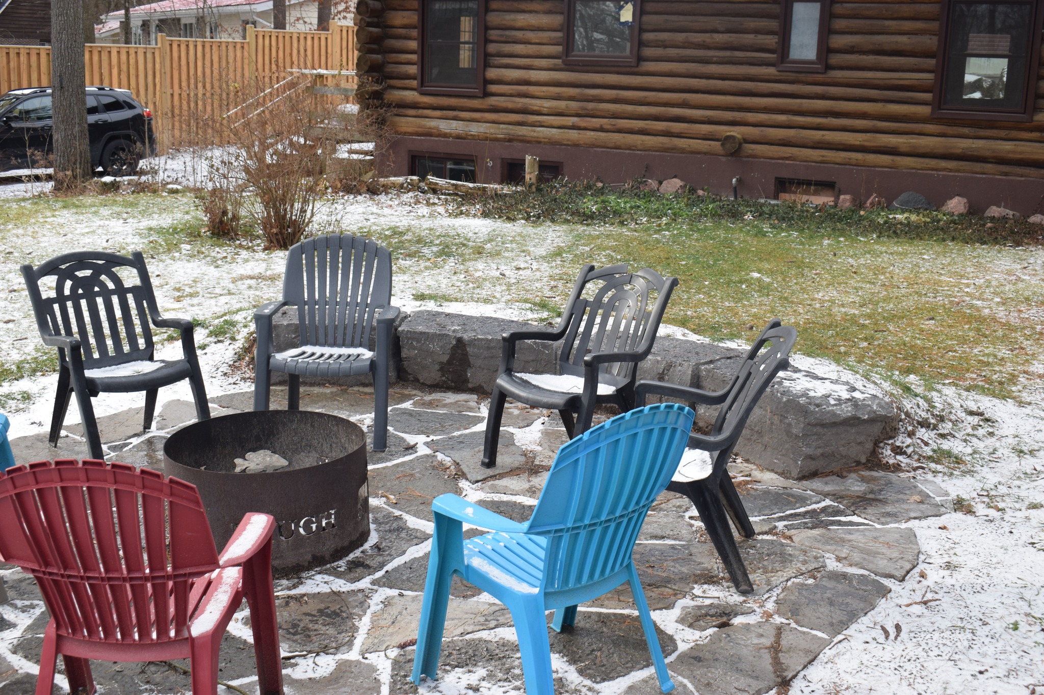 Campfire area on large front lawn with plenty of space for games.