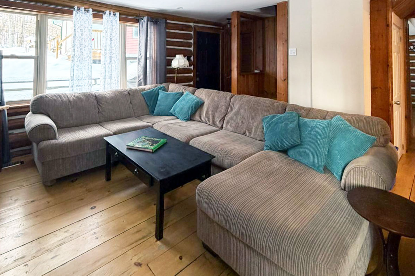 Large living room with log fireplace, big screen TV and hi-speed internet.